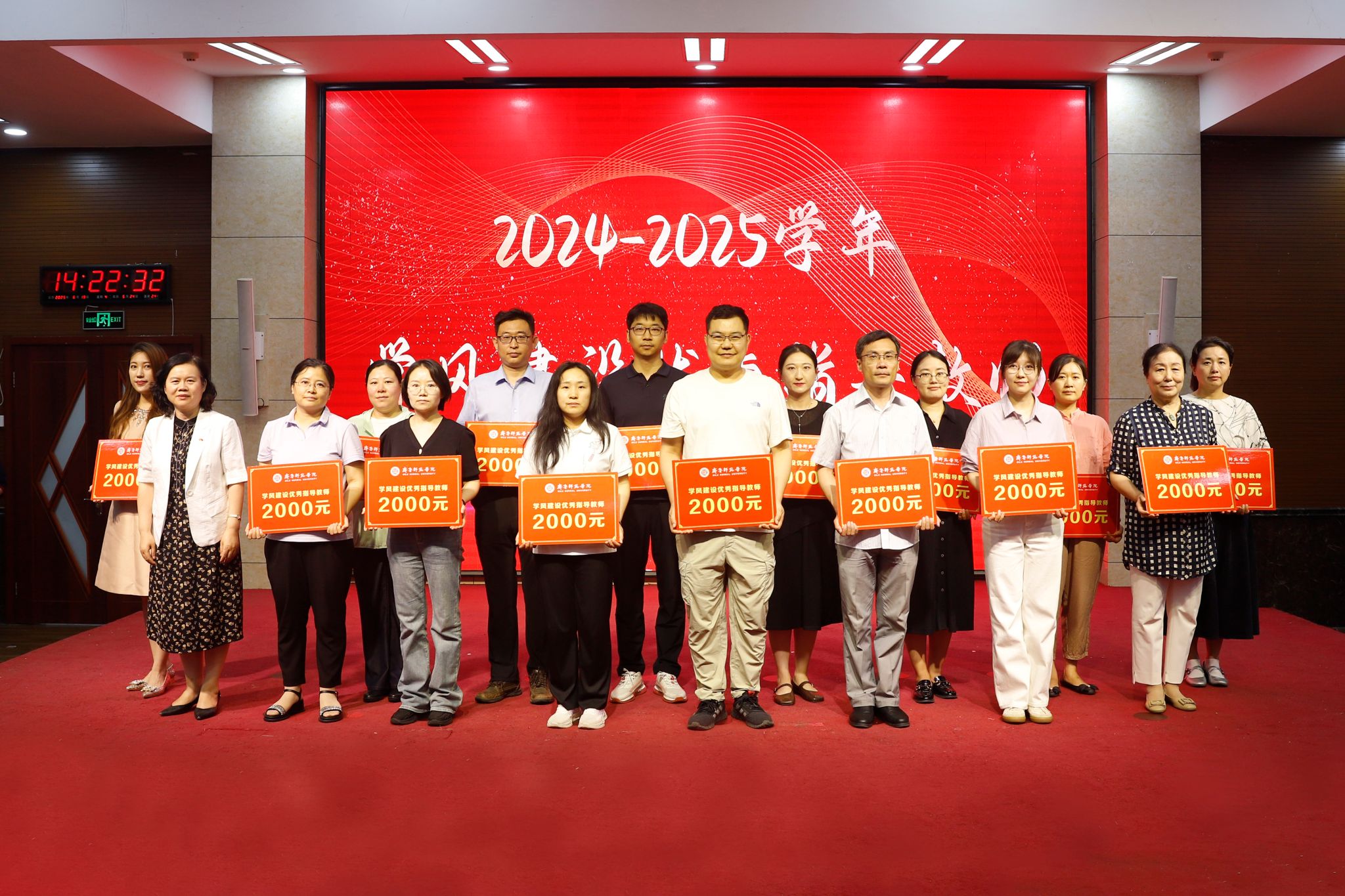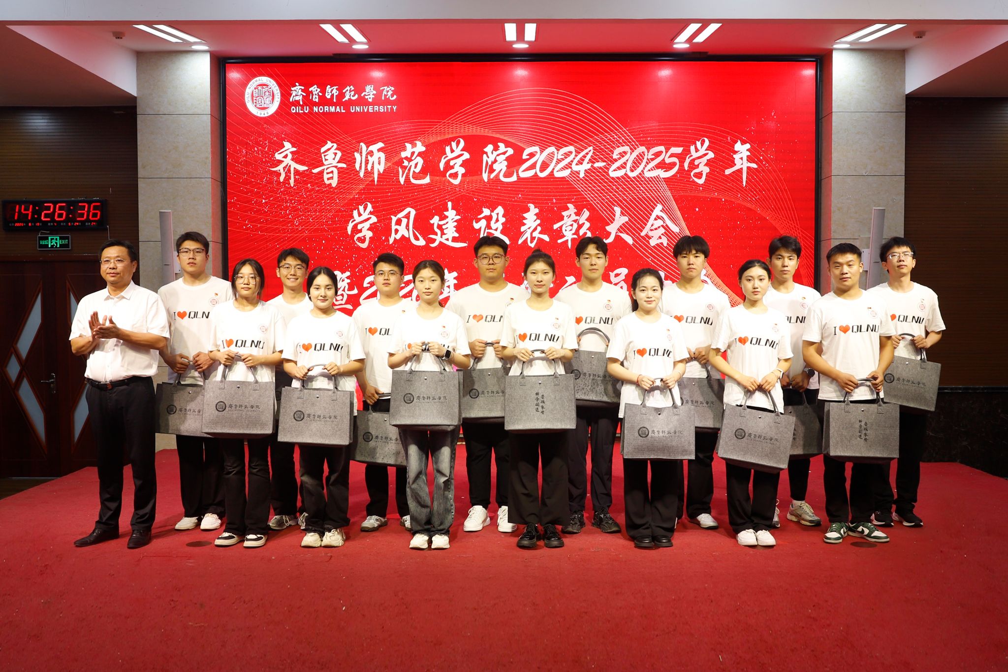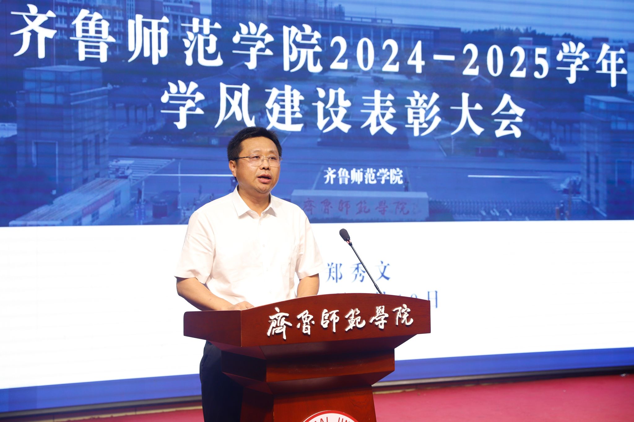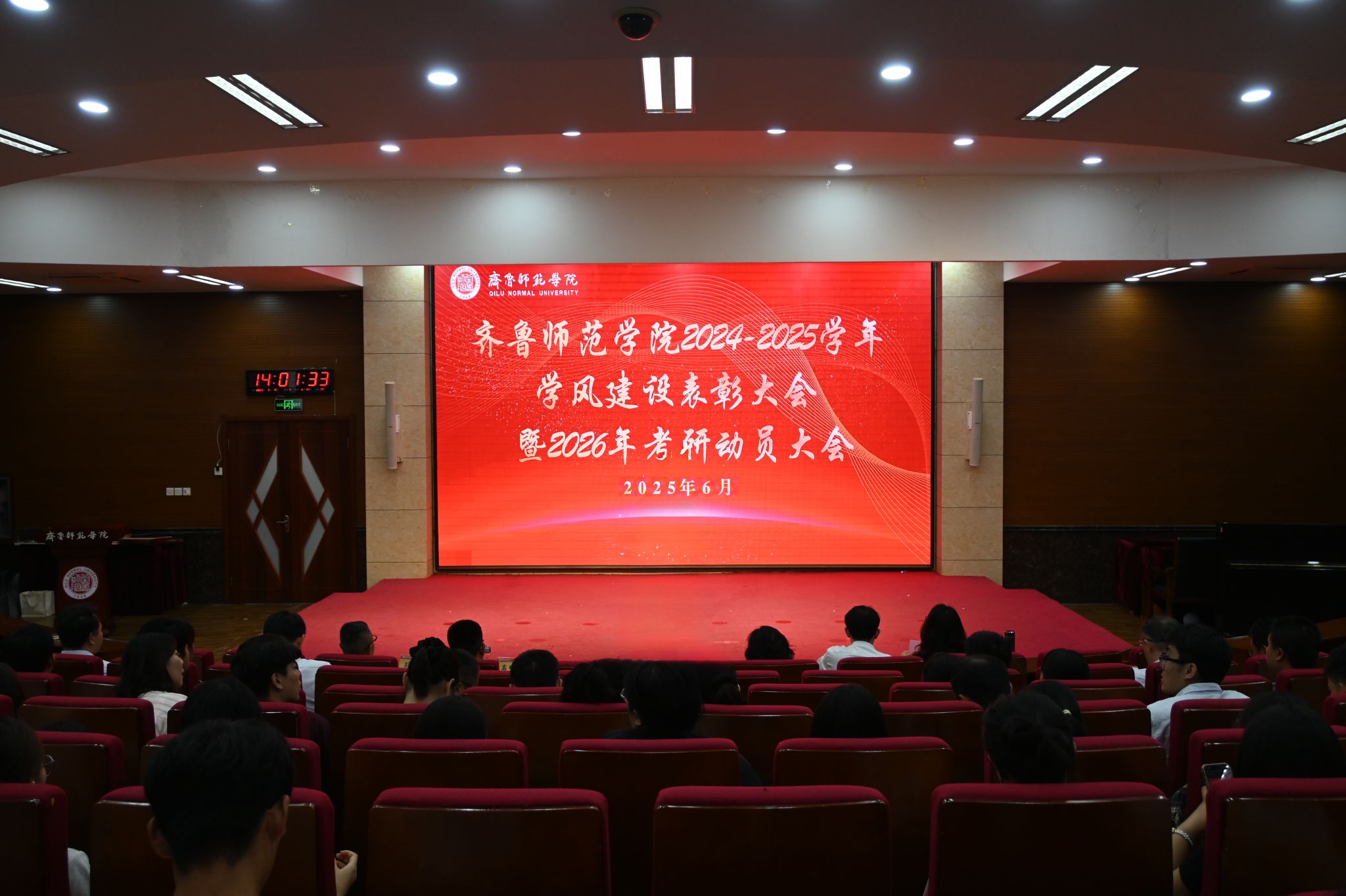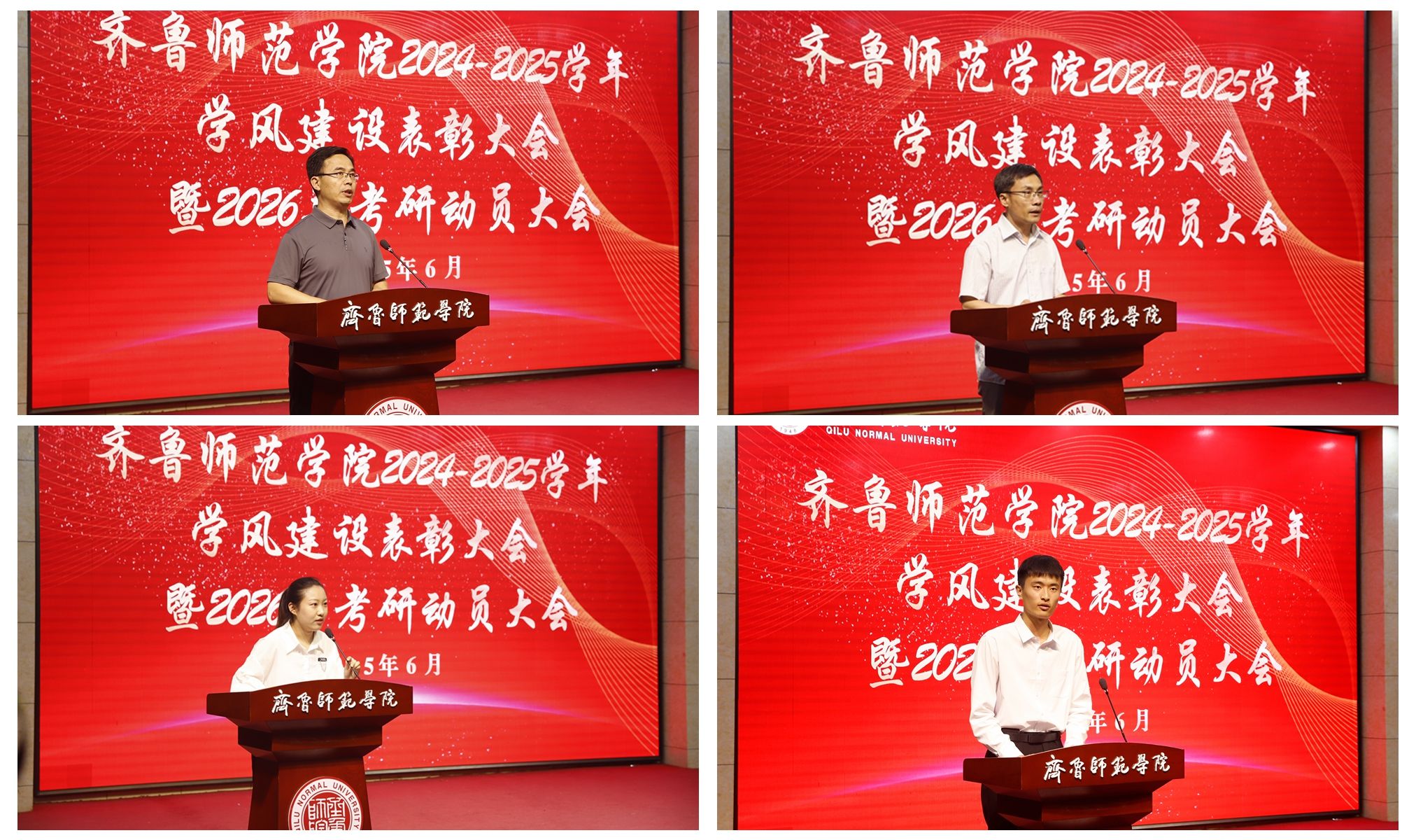 为落实立德树人根本任务,促进学校优良学风建设,激励和引领广大师生向优秀榜样学习,6月19日下午,学校在章丘校区第一学术报告厅举行2024-2025学年学风建设表彰大会暨2026年考研动员大会。学校党委副书记、校长郑秀文,党委副书记赵敏,党委委员、纪委书记、省监委驻齐鲁师范学院监察专员高明辉,党委委员、副校长孙正,党委委员、副校长孙洪兆,党委委员、宣传部部长孙磊出席活动。