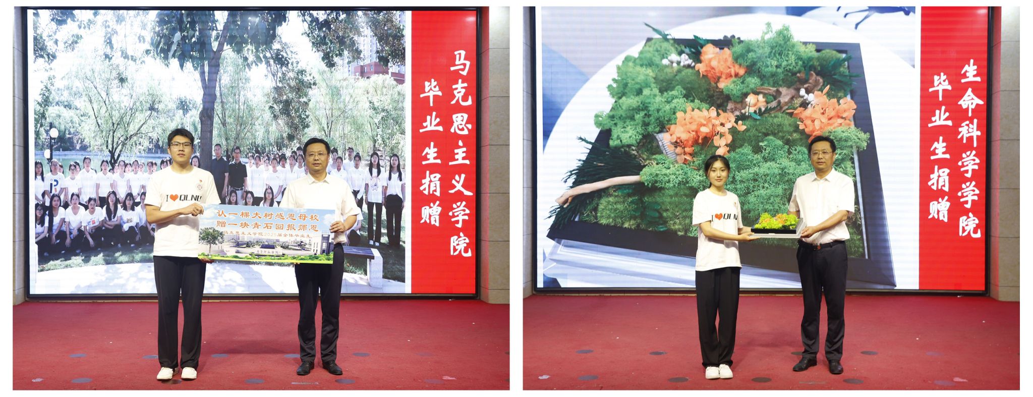 “认一棵大树感恩母校,赠一块青石回报师恩”,为感谢学校的悉心培育,马克思主义学院毕业生代表向学校捐赠“求真砺行”青石,并认养一颗槐树;生命科学学院毕业生代表向学校赠送“青蕤印·生科心”造景作品。郑秀文代表学校向毕业生代表赠送师院文创纪念品和书籍,勉励同学们厚植家国情怀、激扬青春理想,努力成长为德才兼备的时代新人,书写无愧于时代的青春答卷。