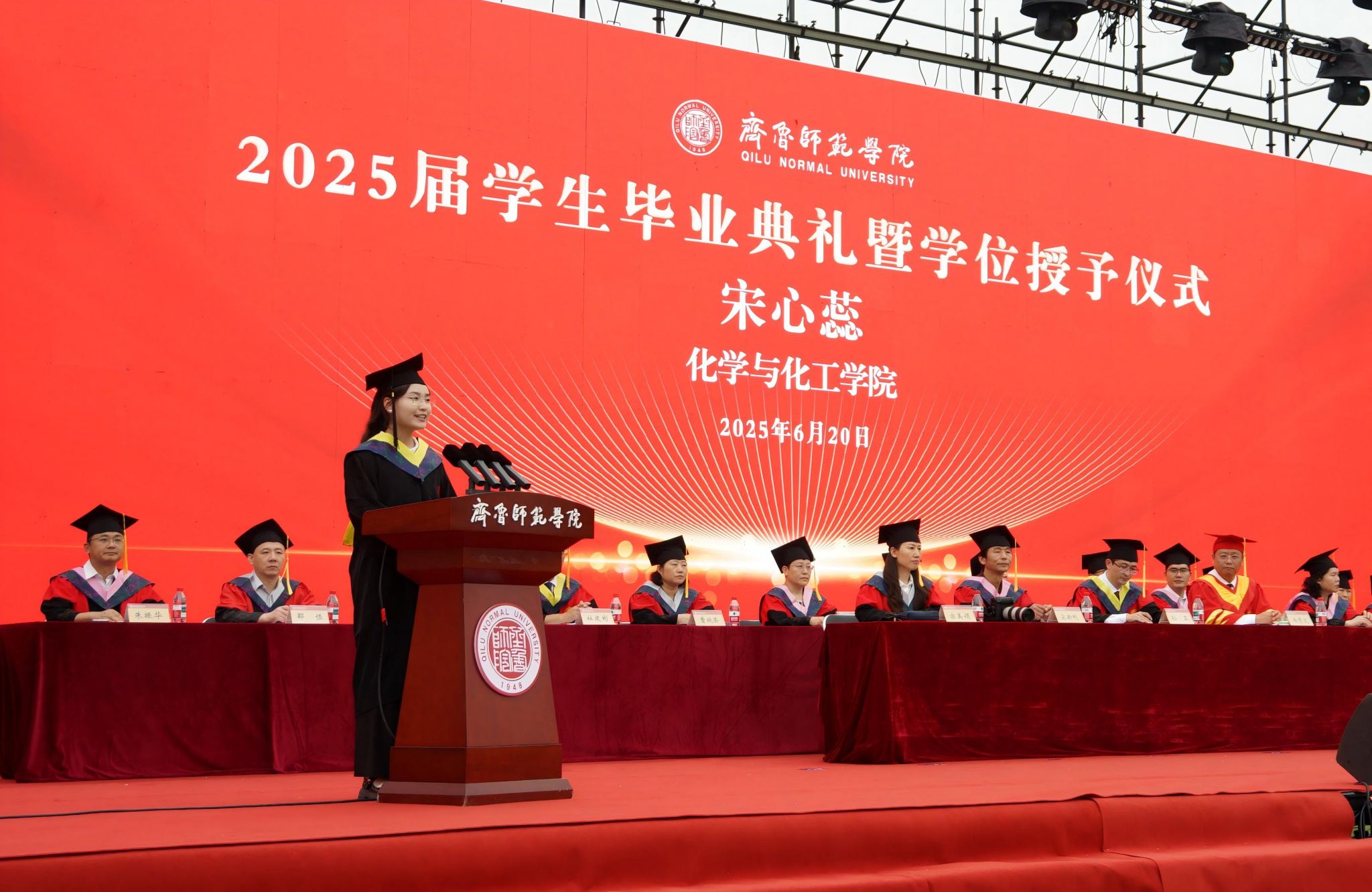 感念师恩似海,共筑君子之品。毕业生代表、化学与化工学院宋心蕊回顾了在师院求学的难忘时光,感谢老师们的辛勤培育。她号召全体毕业生,牢记母校的教诲,树立君子品格,将“仁义礼智信”作为道德准则;展现君子智慧,用“格物致知”的治学态度探索真理;践行君子担当,在实现中华民族伟大复兴的征程中贡献青春力量,以师院人特有的精神气质,让母校的育人成果在祖国最需要的地方开花结果。