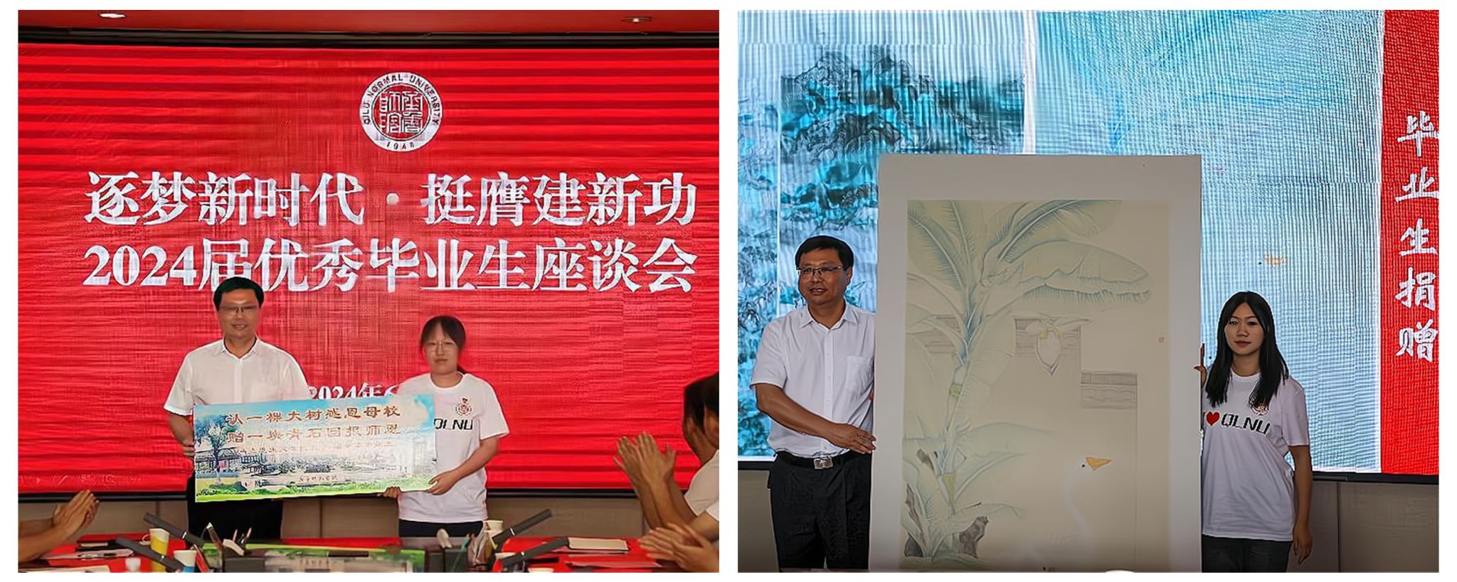 随后,为感谢学校的悉心培育,马克思主义学院毕业生代表向学校捐赠“认一棵大树感恩母校,赠一块青石回报师恩”;美术学院毕业生代表向学校赠送2幅书画作品。郑秀文代表学校向毕业生代表赠送《习近平的七年知青岁月》《基于能力范式的教学改革理论创新和实践》和师院文创纪念品,勉励同学们厚植家国情怀、激扬青春理想,实现自身的成长与发展,让青春在祖国最需要的地方绽放光彩。