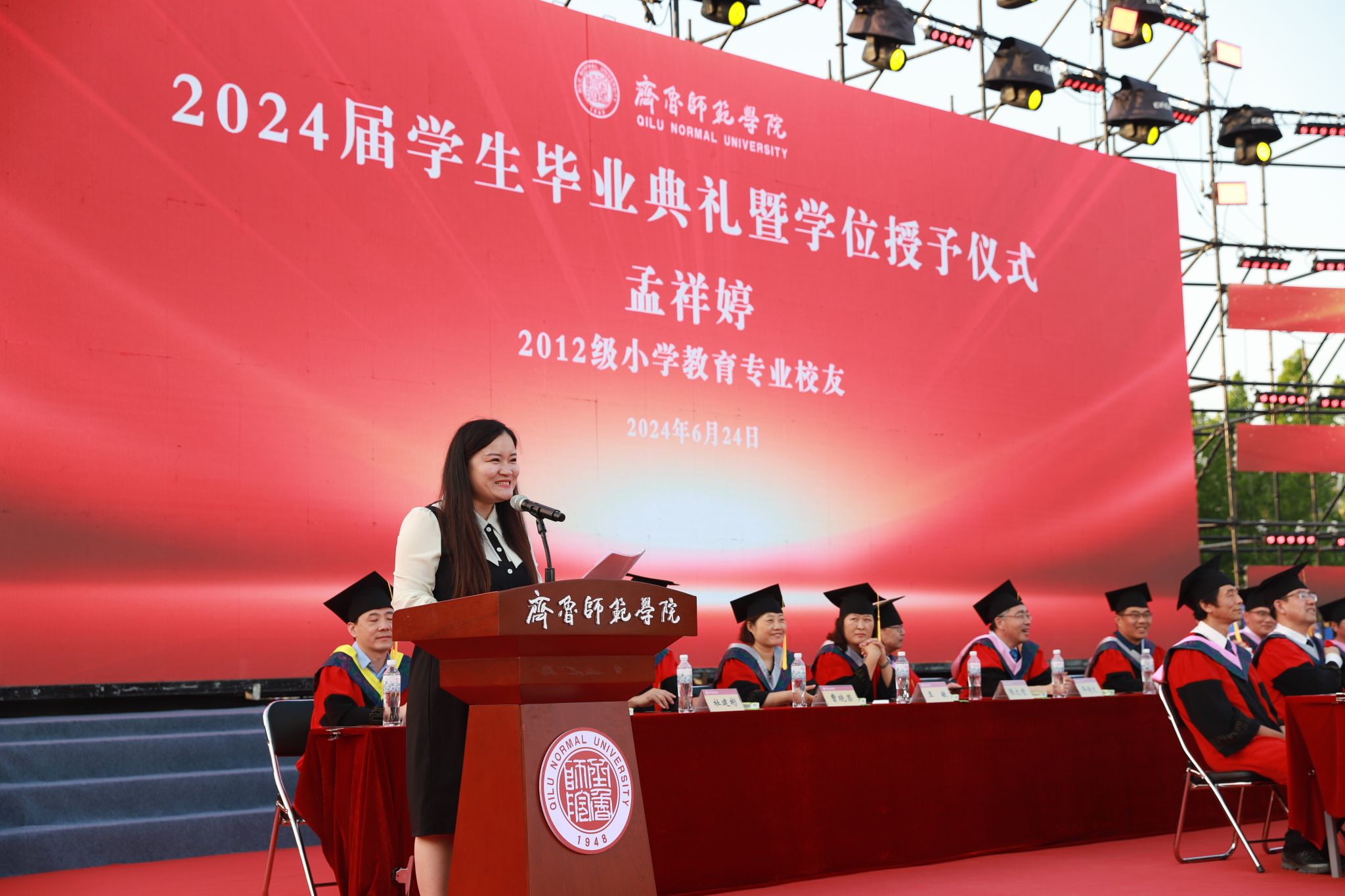 矢志不渝,乐育桃李。校友代表、2012级小学教育专业孟祥婷深情回忆了在母校的成长与收获,表达了对母校的深切思念和感激之情,分享了自己毕业后投身教育事业、扎根教学一线,在建设教育强国伟大征程中砥砺育才的感人故事,并鼓励毕业生带着母校的嘱托祝福扬帆起航,发挥专业特长,赓续师院荣光,为全面建设社会主义现代化国家贡献师院力量。