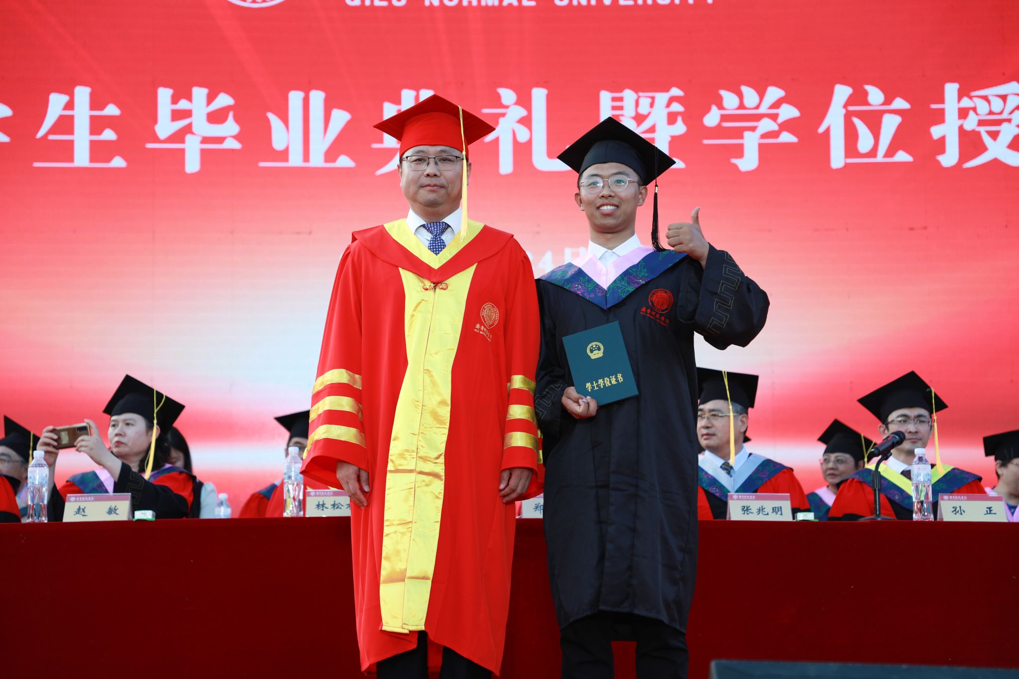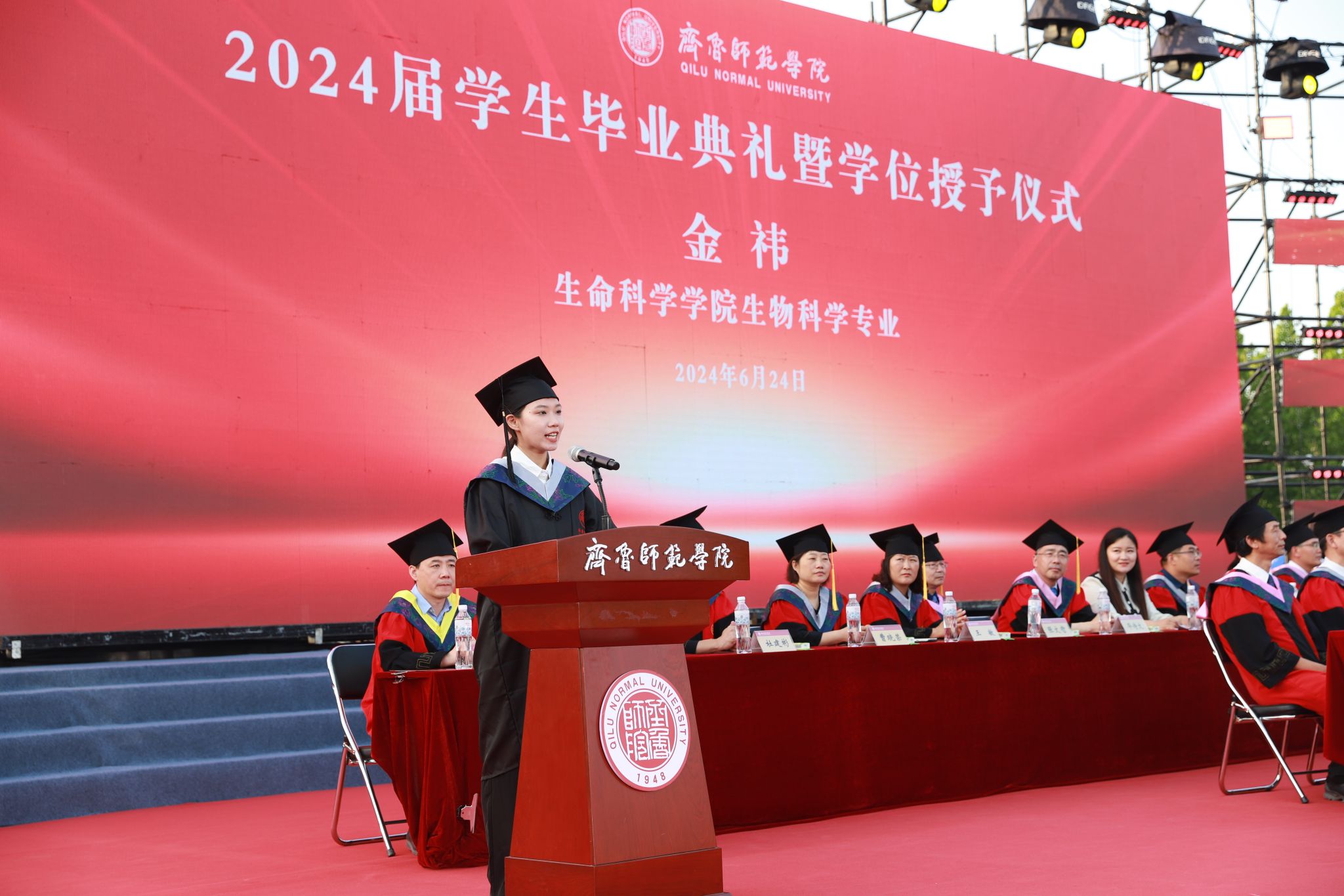 同心同德、奋勇向前。毕业生代表、生命科学学院2020级生物科学2班金祎在发言中表达了对母校的感激之情,分享了个人大学四年的成长和荣誉,鼓励同学们铭记“博学明道 崇德象贤”校训,继承发扬以国家民族命运为己任的爱国主义精神,无论身在何种岗位、从事哪种职业,都努力践行“请党放心,强国有我”的铿锵誓言,自觉让个人成功的果实结在爱国主义这棵常青树上。