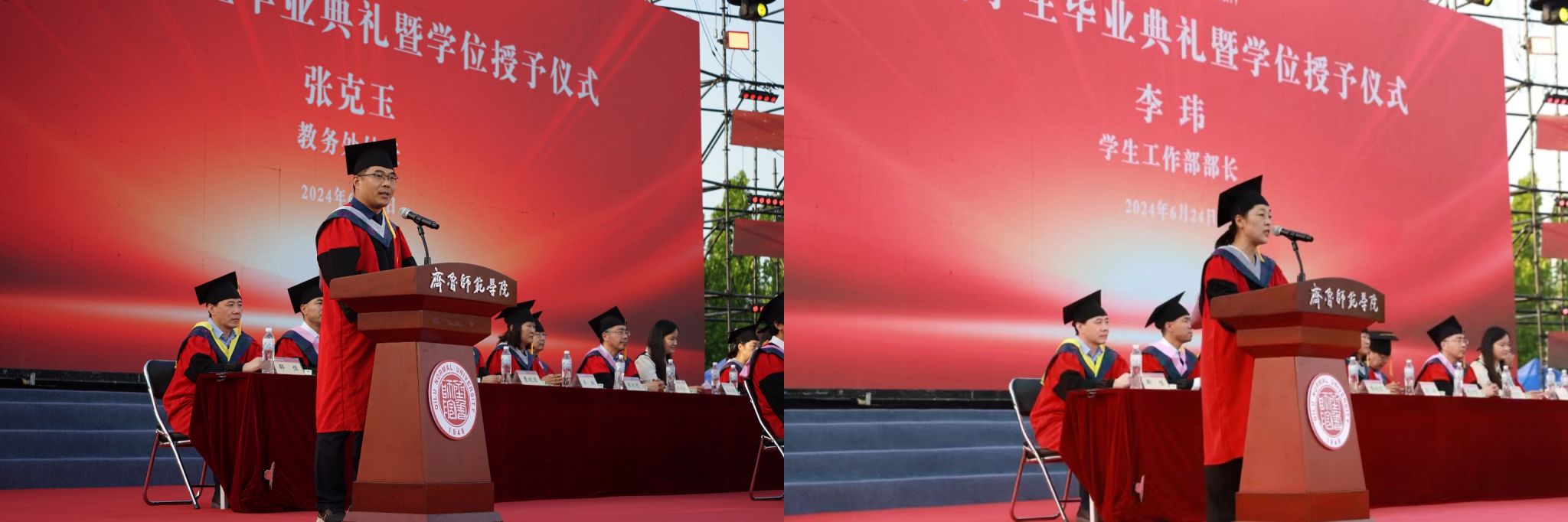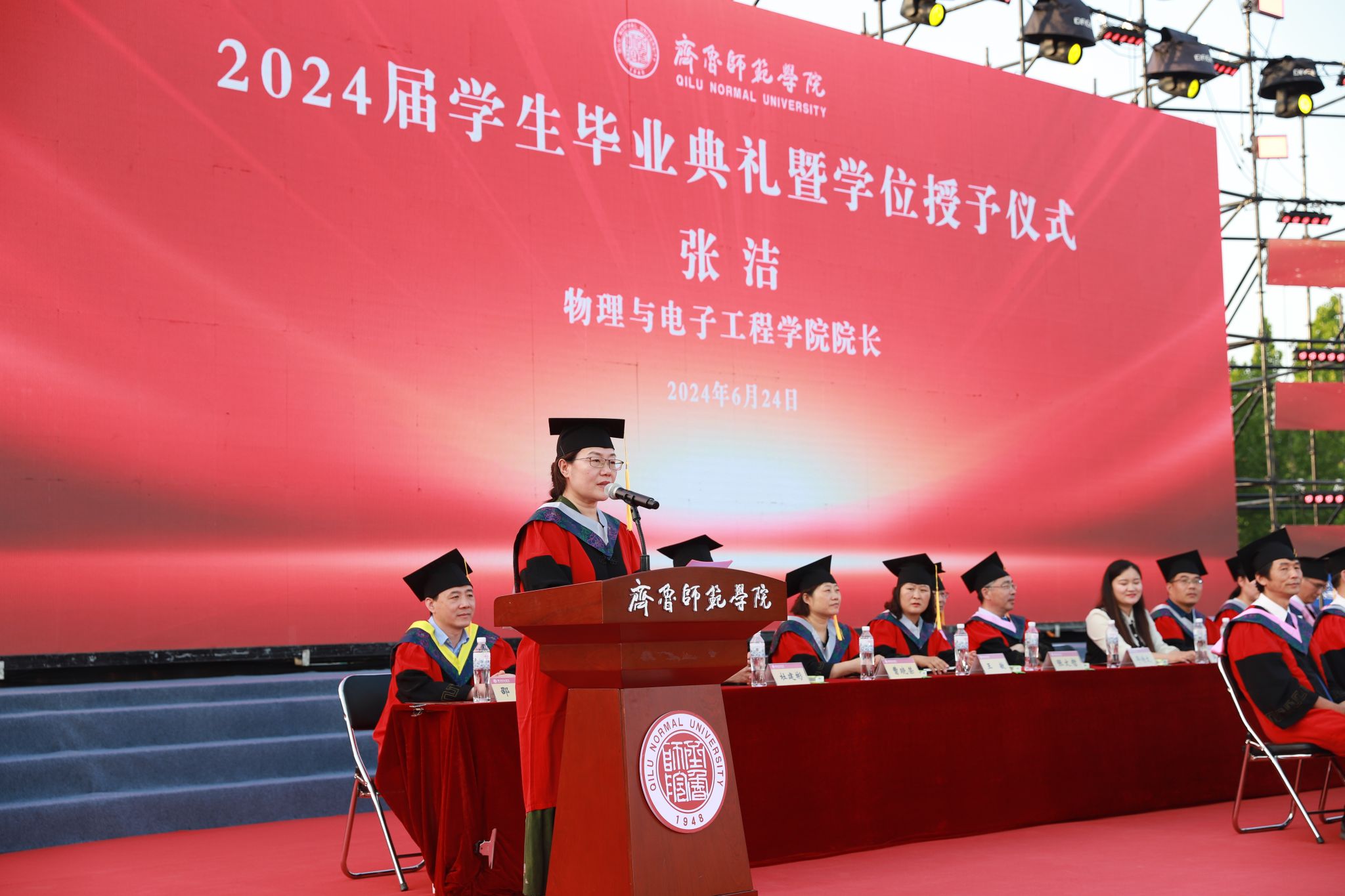殷殷嘱托,情深意长。教师代表、物理与电子工程学院院长张洁在致辞中向2024届毕业生表达了祝贺和祝福,强调了心怀感恩、终身学习和家国情怀的重要性,鼓励毕业生“立大志、明大德、成大才、担大任”,谱写于国有功、于校有荣、于己有彩的人生华章,祝愿学子大展宏图、前程似锦!