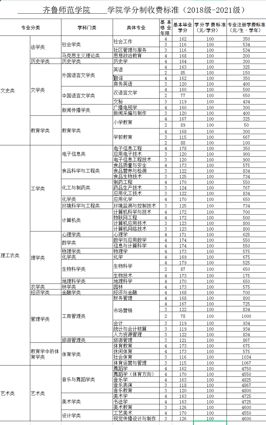 2018-2021年齐鲁师范学院学分制标准